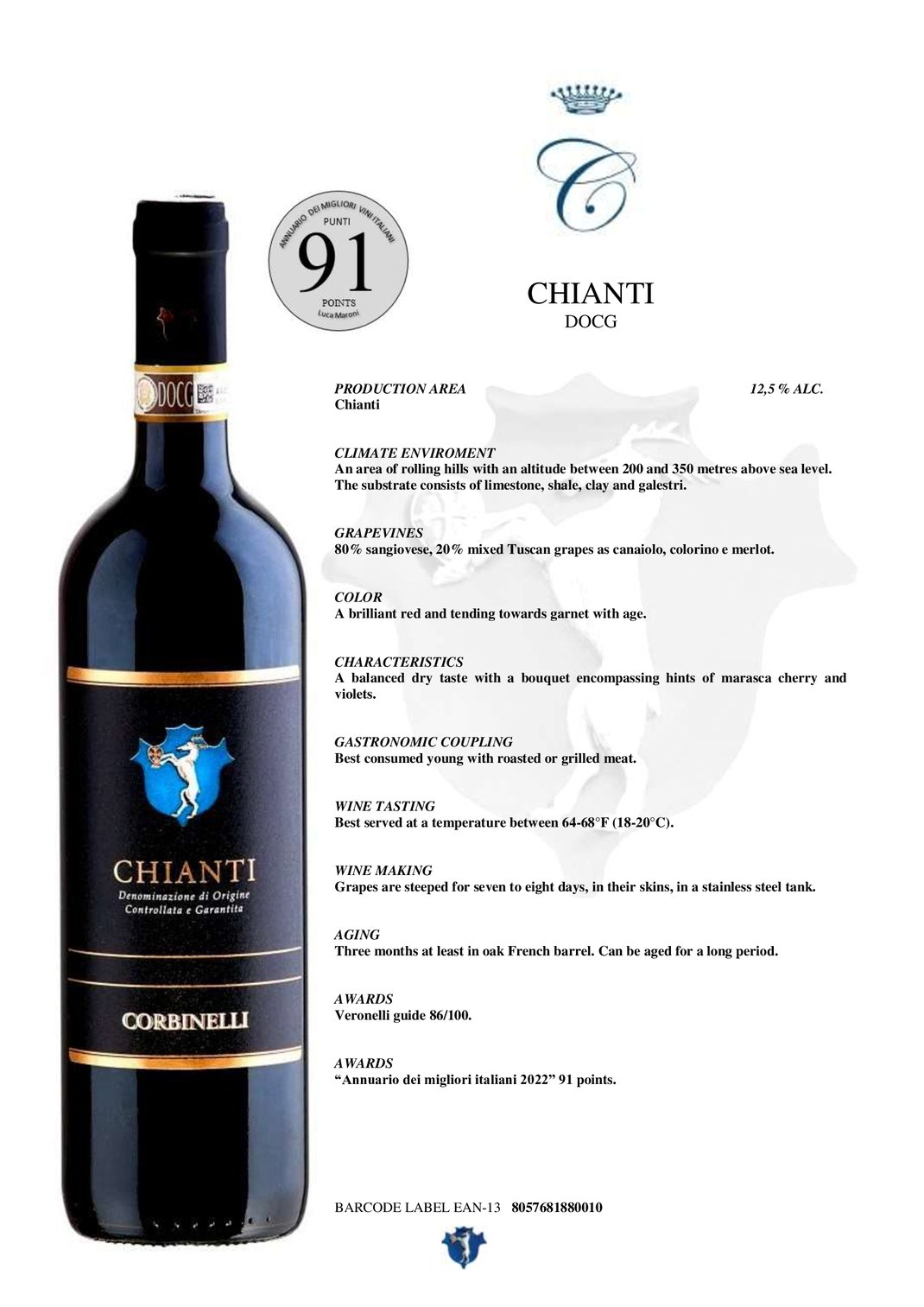 Provincia di Firenze e Siena. PRODUCTION AREA The province of Florence and Siena. AMBIENTE PEDOCLIMATICO Zone collinari con altitudine compresa fra i 200 ed i 350 msl, substrati calcarei scisti argillosi e galestri. CLIMATE ENVIROMENT An area of rolling hills with an altitude between 200 and 350 metres above sealevel. The substrate consists of limestone, shale, clay and galestri. VITIGNI Almeno 80% sangiovese, 20% di altri vitigni a bacca rossa come canaiolo, colorino e merlot. GRAPEVINES 80% sangiovese, 20% mixed Tuscan grapes as canaiolo, colorino e merlot. COLORE Rosso brillante tendente al granato con invecchiamento. COLOR A brilliant red and tending towards garnet with age. CARATTERISTICHE Vino con bouquet ampio dal sapore fruttato floreale con note di marasca, viola e frutti di bosco. Talvolta con sentori di tostato e vaniglia. CHARACTERISTICS A balanced dry taste with a bouquet encompassing hints of movella cherry and violets. ABBINAMENTI GASTRONOMICI Indicato con minestre saporite, arrosti, selvaggina e bistecca alla fiorentina. GASTRONOMIC COUPLING Best consumed young with roasted or grilled meat. DEGUSTAZIONE Da servirsi ad una temperatura di 18-20 °C. WINE TASTING Best served at a temperature between 64-68°F(18-20°C). VINIFICAZIONE Fermentazioni che possono durare per quindici giorni o più a seconda delle annate. Il vino è mantenuto in continuo rimontaggio in serbatoi di acciaio inox. WINE MAKING Grapes are steeped for seven to eight days, in their skins, in a stainless steel tank. INVECCHIAMENTO Almeno tre mesi in botti di rovere francese, data la struttura questo vino può essere invecchiato per un lungo periodo. AGING Three months at least in oak French barrel. Can be aged for a long period. RICONOSCIMENTI Nella guida "I vini di Veronelli" 86/100. AWARDS Veronelli guide 86/100