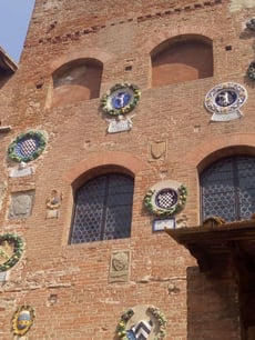 Отличительной особенностью здания являются усыпавшие его фасад гербы из глазурованной терракоты, мрамора, тосканского песчаника, которые размещались различными наместниками-викариями, занимавшими палаццо с XV по XVIII вв. На каждом гербе изображены отличительные знаки викария и размещена надпись с датами его пребывания в должности.